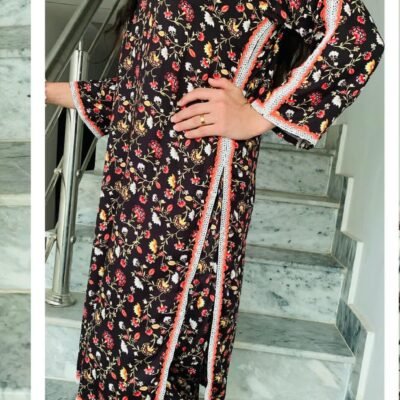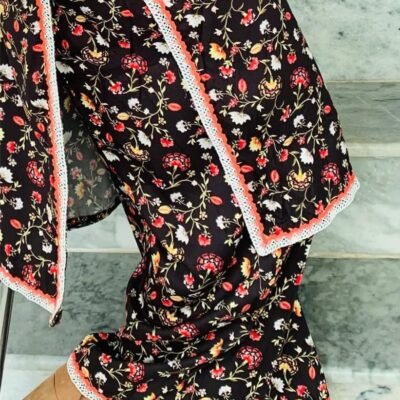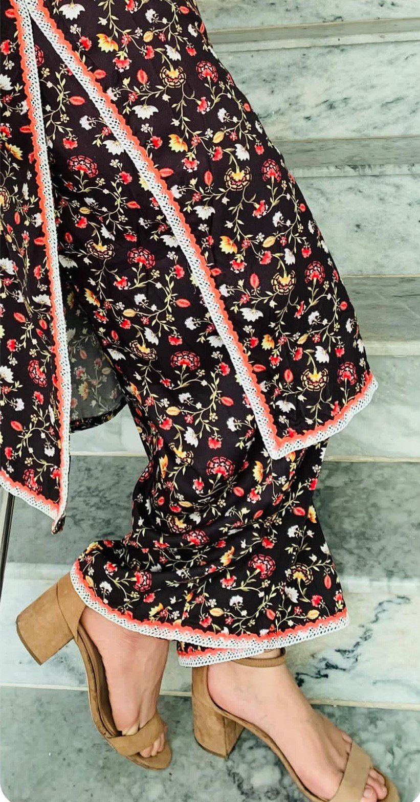 Step into elegance with our printed Marina suit – a perfect blend of comfort and chic style. Crafted from soft marina fabric, this outfit features a deep plum base adorned with delicate floral prints, finished with lace detailing on sleeves and borders for a graceful touch.