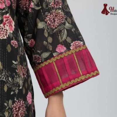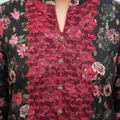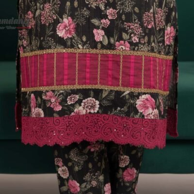 Crafted on premium fabric, the shirt features a beautifully embroidered neckline, adorned with fancy buttons for a refined, feminine touch. The organza lace detailing on the sleeves and daman adds a hint of luxury, while the organza lace at the shirt hem enhances its graceful fall. The silk hemming on the chaak gives the outfit a neat and polished finish.