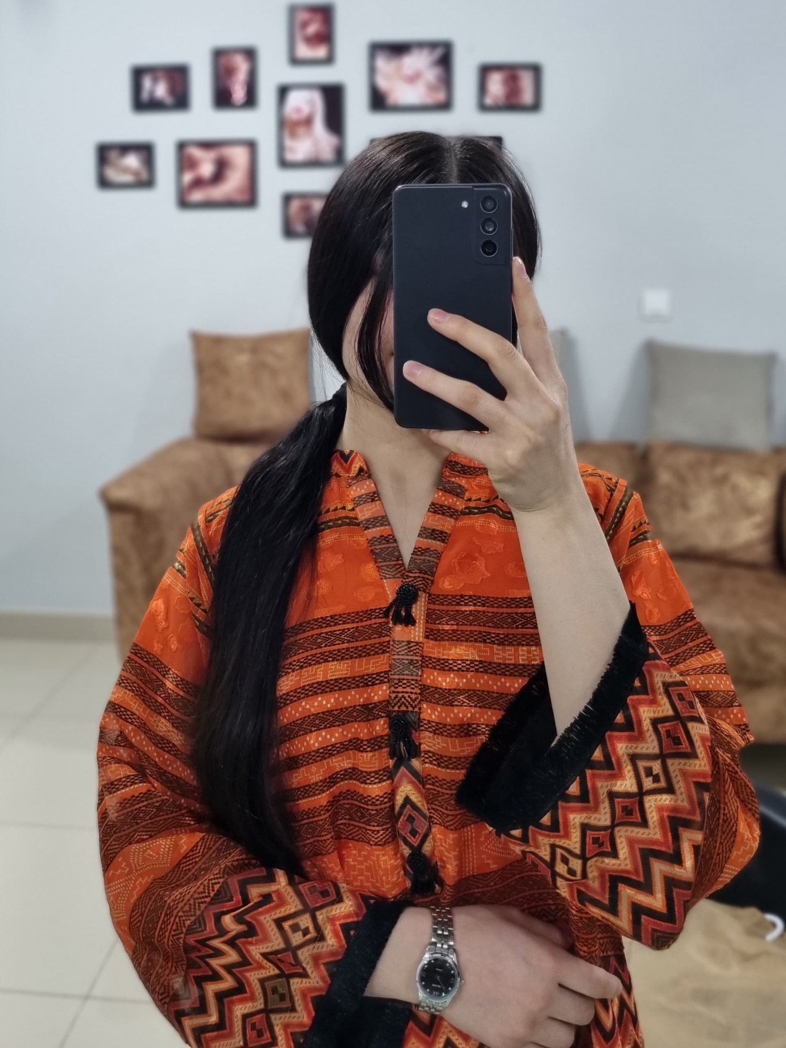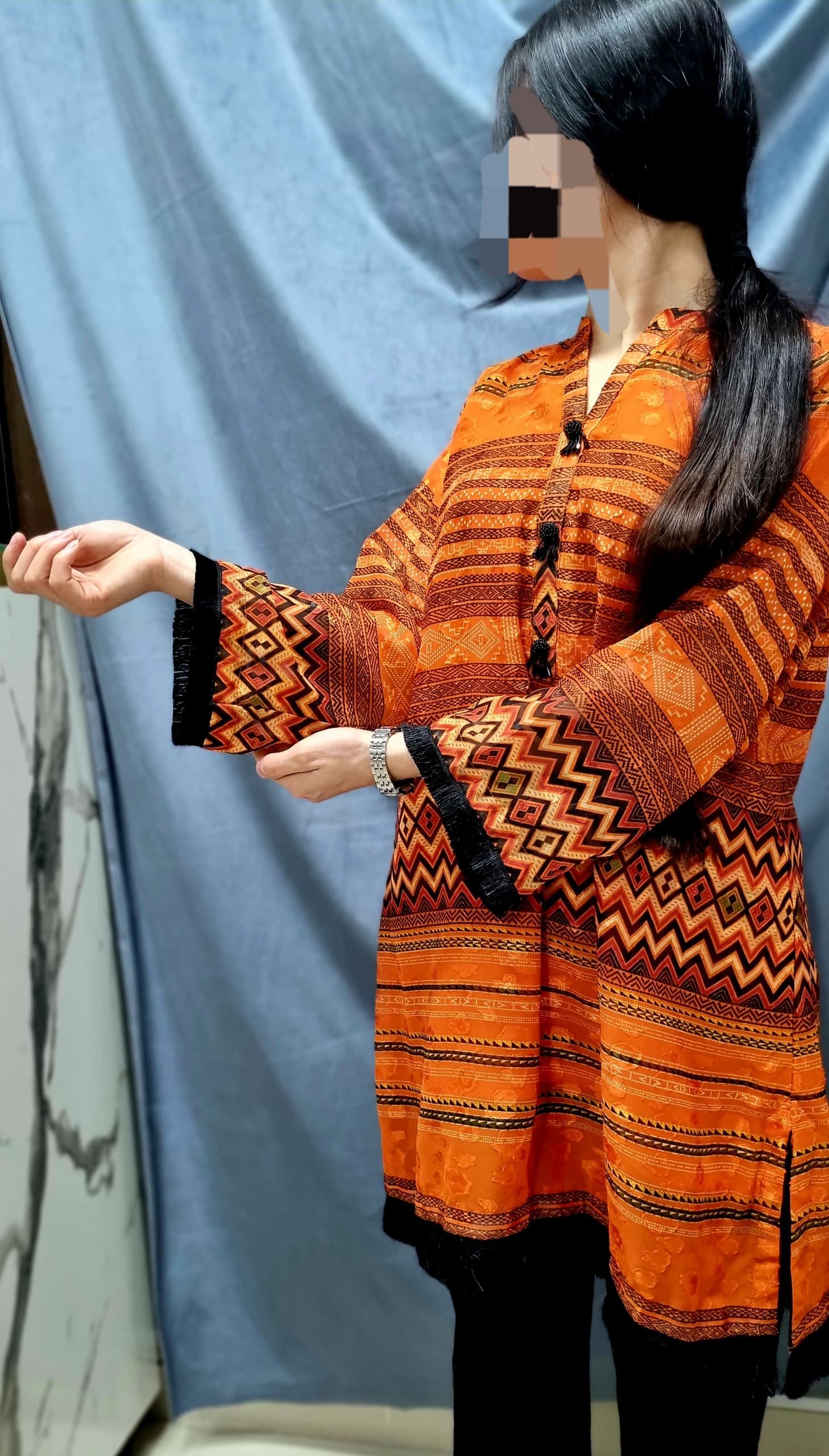 This is a beautiful stitched chiffon shirt in vibrant orange with black ethnic patterns. ✨