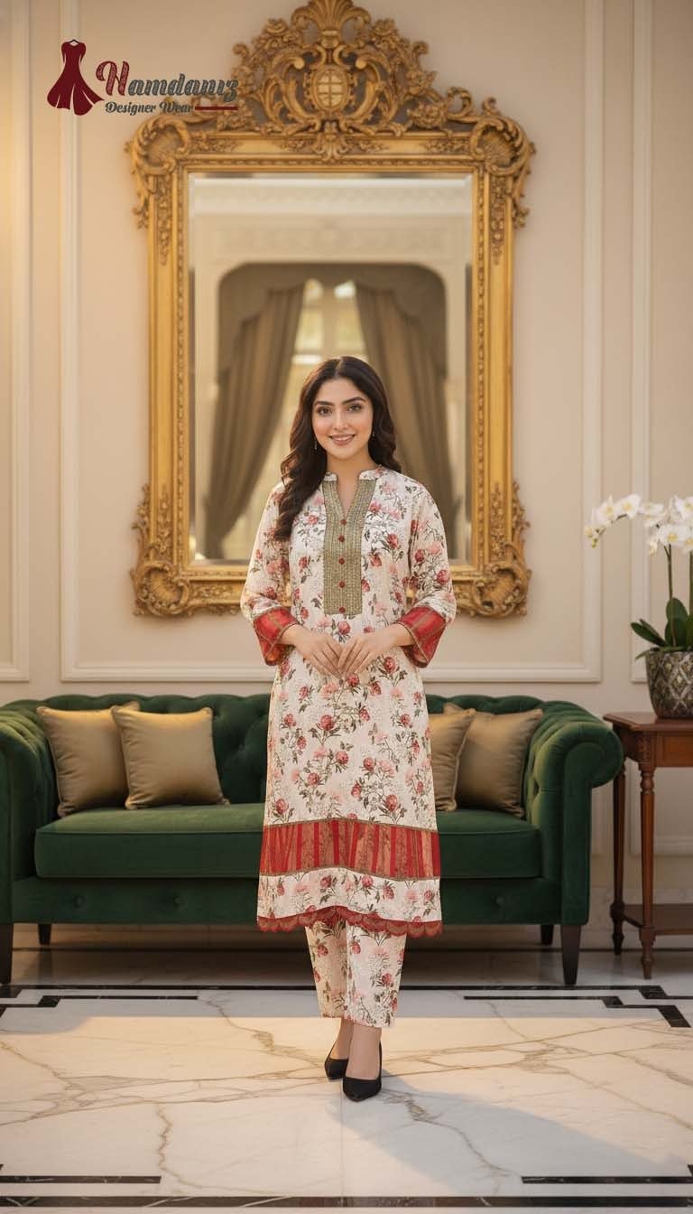 Elevate your wardrobe with this elegant two-piece outfit by Hamdaniz Designer Wear, crafted to blend timeless grace with modern sophistication. The shirt features a beautifully embroidered neckline adorned with fancy buttons, adding a refined touch to the overall look. The laced organza detailing on the sleeves and daman enhances its feminine charm, while the organza lace at the bottom of the shirt brings graceful movement and a luxurious finish.