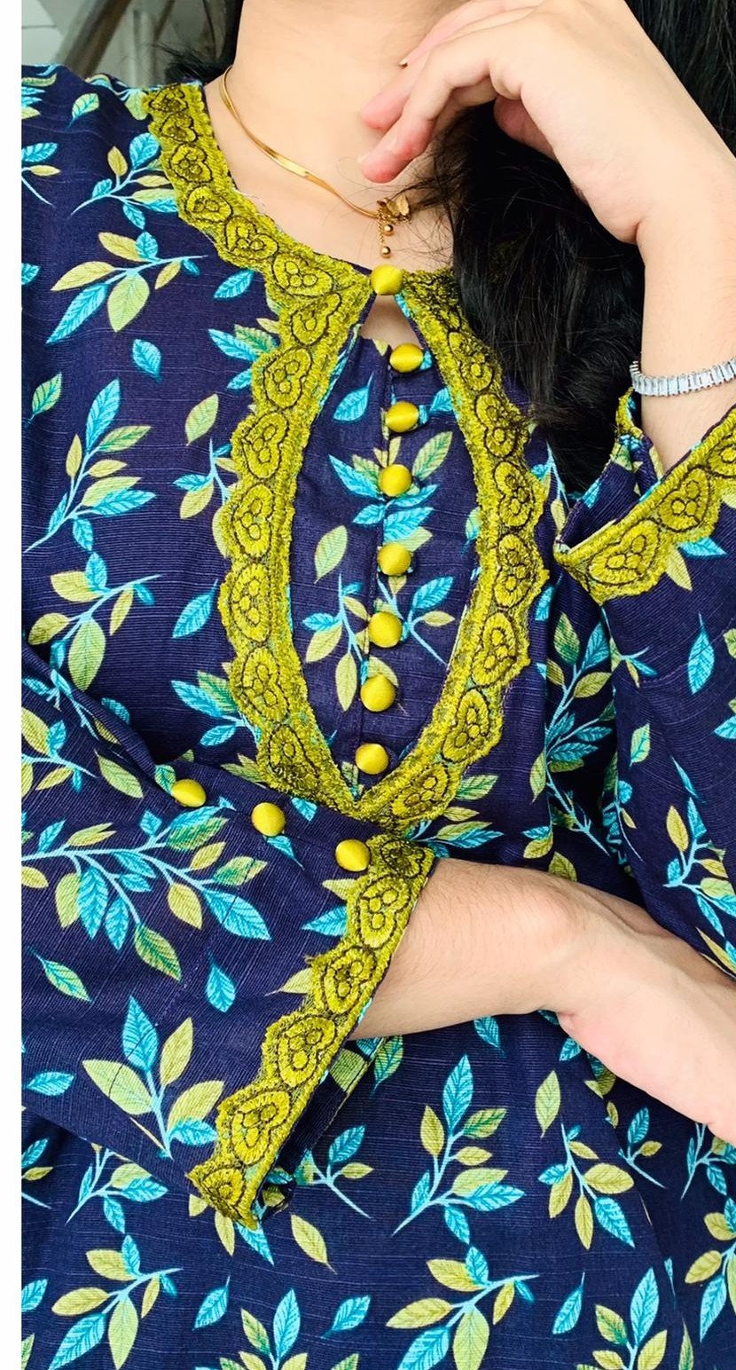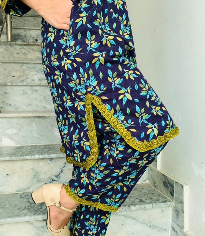 π Details: Finished with mustard lace on neckline, sleeves, hem, and trouser borders.