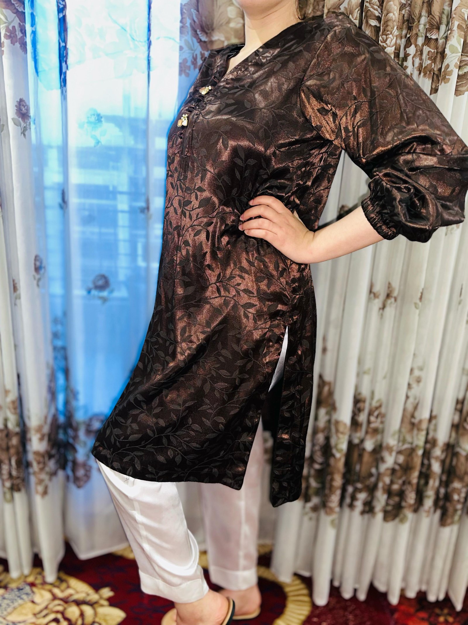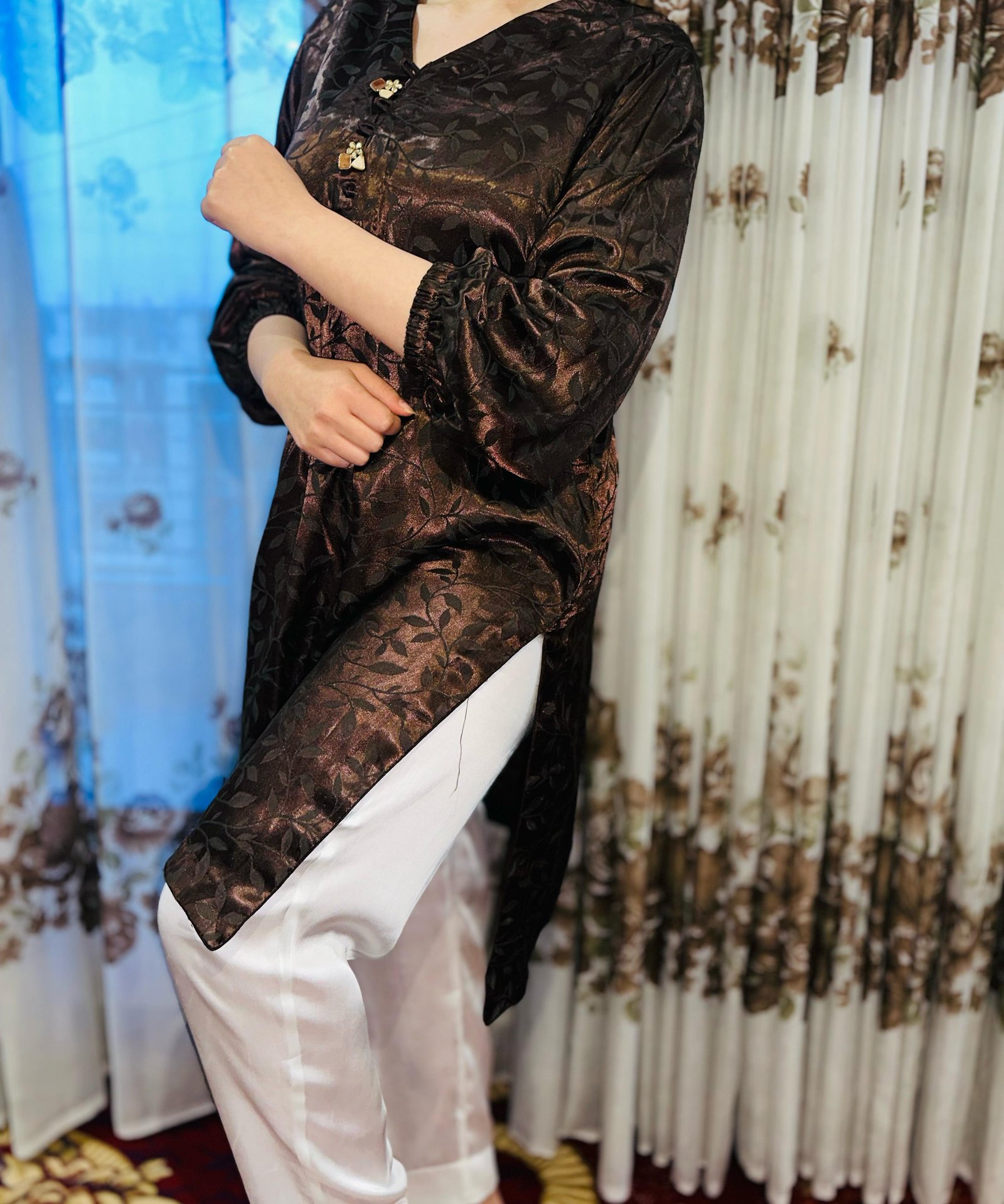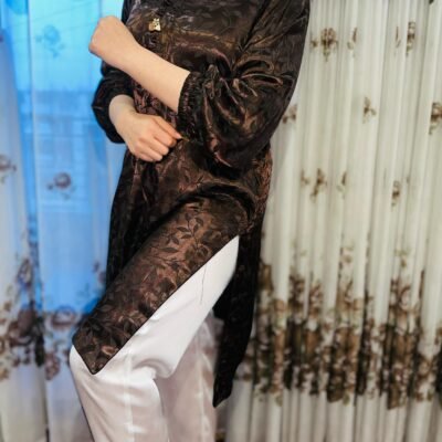 Stay cozy yet chic with this Winter Silk Two-Piece Suit. The rich dark brown silk shirt features a subtle self-printed floral pattern with delicate button details, paired with a crisp plain white trouser for a graceful contrast. The warm and glossy silk fabric makes it an ideal choice for winter evenings and festive gatherings.